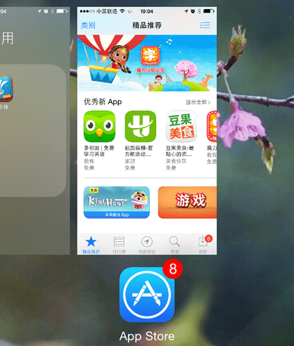 当遇到 App Store 在尝试多次都无法打开的情况下,我们可以先把 App Store 从后台关闭。连续按2次Home键,在后台找到 App Store 应用,把 App Store 向上滑动拖出去关闭。
