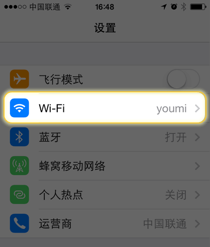在设置列表中的点击 “Wi-Fi” 一栏,如图所示: