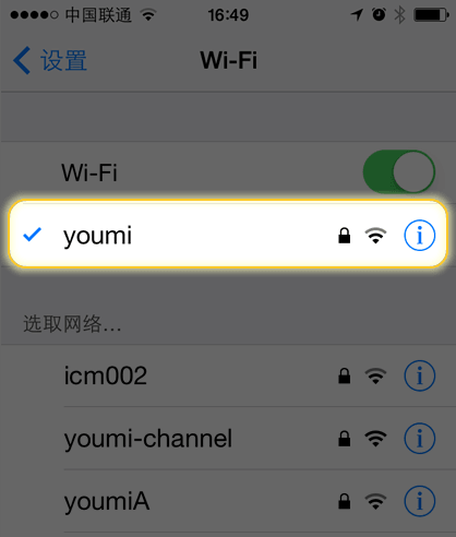 点击 Wi-Fi 可以看到当前连接的无线网络,请点击右侧的ⓘ叹号图标,如图所示: