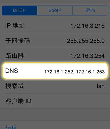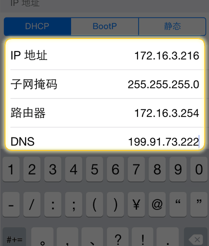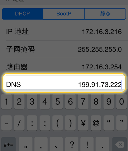 随后可以看到无线网络参数,点击 DNS 这一栏右侧的 IP 地址,在此栏中输入199.91.73.222 或者 178.79.131.110,再点击返回 Wi-Fi,如图所示: